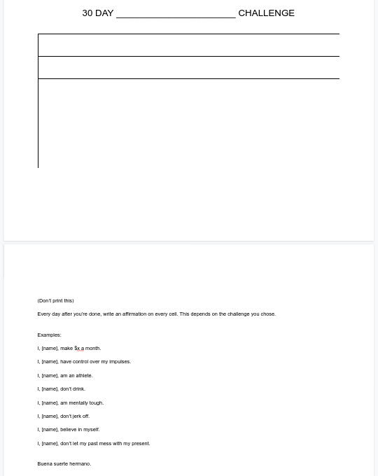 A short, content-dense document focused on HOW to allow $$$, abundance, health and positive momentum to enter your life.It’s very simple.Inside you'll find 10 challenges. Challenges taken by thousands of men around the world (with remarkable results).Pick one.Then simply use the HOW of each challenge to get WHATEVER you want out of life in 30 days:Money