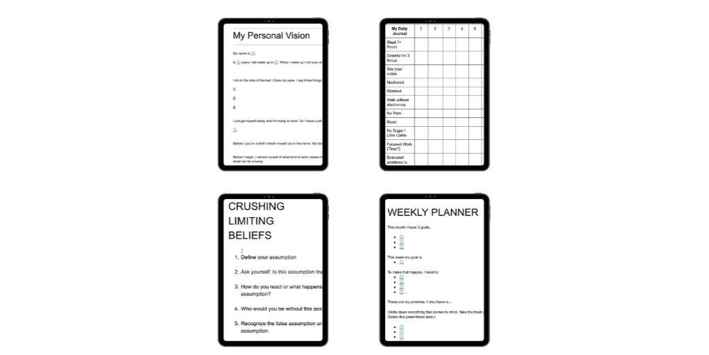 1) Crushing Limiting Beliefs2) Crafting Your Vision3) Weekly Planner4) High Value Daily Checklist