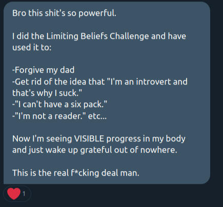 Crushing limiting beliefs(plus 6 more challenges I'll explain to you in a minute).Every single challenge has the power to make you a BEAST.So don’t be surprised when people ask you "What the f*ck did you do and how can I do it too?!"(Some people tell me they don't sleep in since. They were too excited so they just started working before everyone woke up lol).
