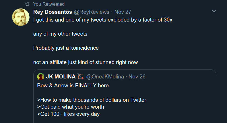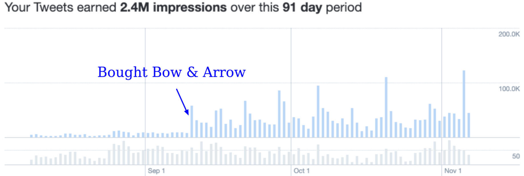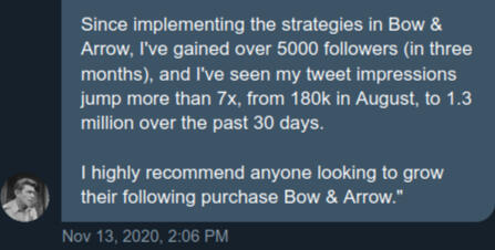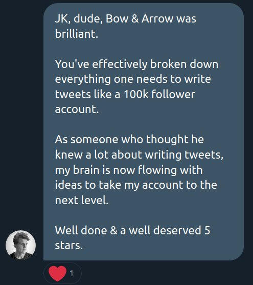 Bow & Arrow is a philosophy of action:It will show you to write in a way that will make people do what you want them to do:Retweet.Follow.Purchase.You name it.Many people have made money with this method already,And it's easy to see why:It's not based on talent.It's not based on inspiration.It's based on a system that is supposed to be repeated because it just pays very well.I get 100+ likes on my tweets every day.Not only for me,But for my clients and the people who ask me for help.And just so you know:This is not random.It's the magic that comes from ghostwriting.Salesmanship.And copywriting COMBINED.All revealed in a single chamber of secrets: